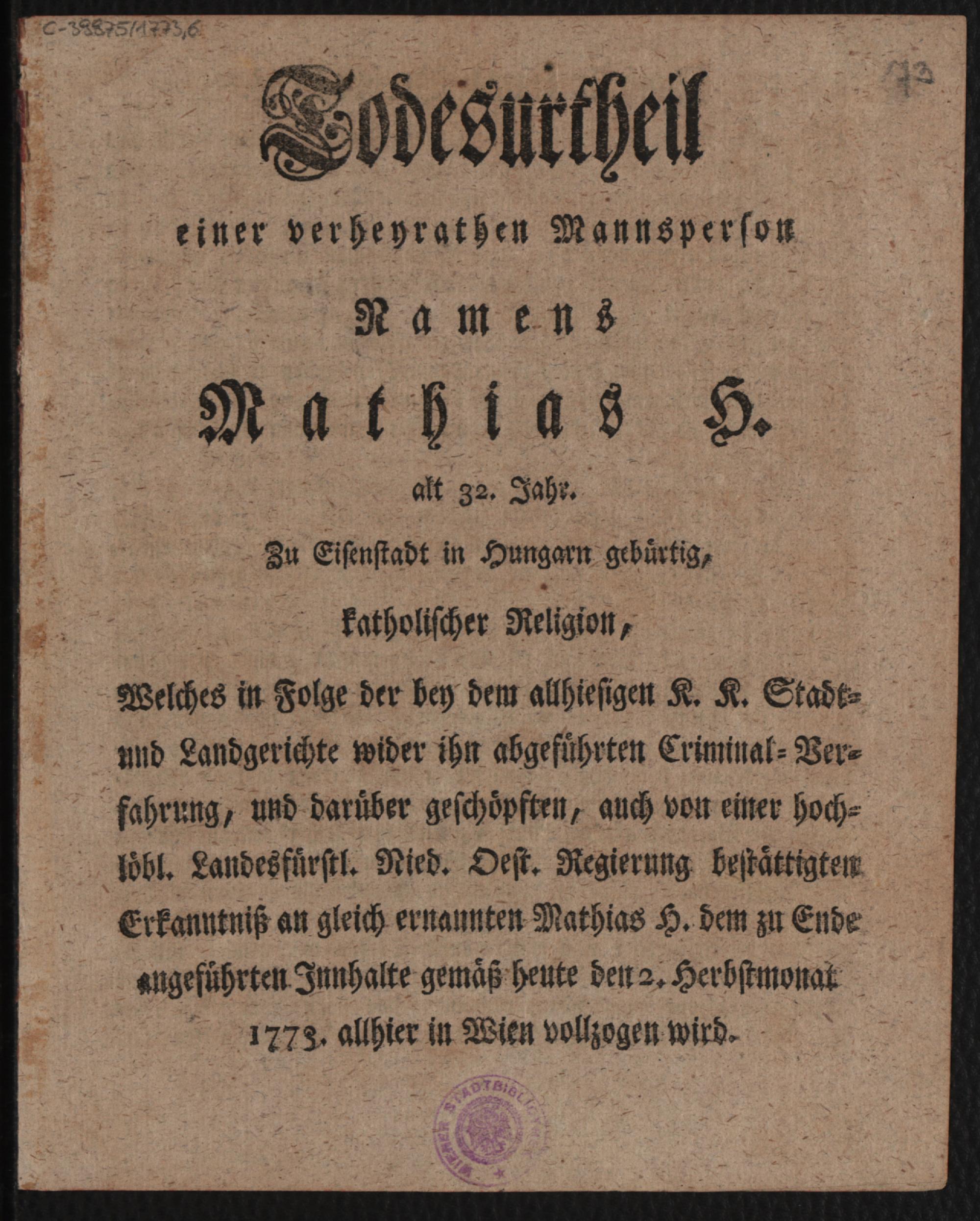 Todesurtheil einer verheyrathen Mannsperson Namens Mathias H. alt 32. Jahr Zu Eisenstadt in Hungarn gebürtig, katholischer Religion : Welches in Folge der bey dem allhiesigen K. K. Stadt- und Landgerichte wider ihn abgeführten Criminal-verfahrung ... heute den 2. Herbstmonat 1773. allhier in Wien vollzogen wird