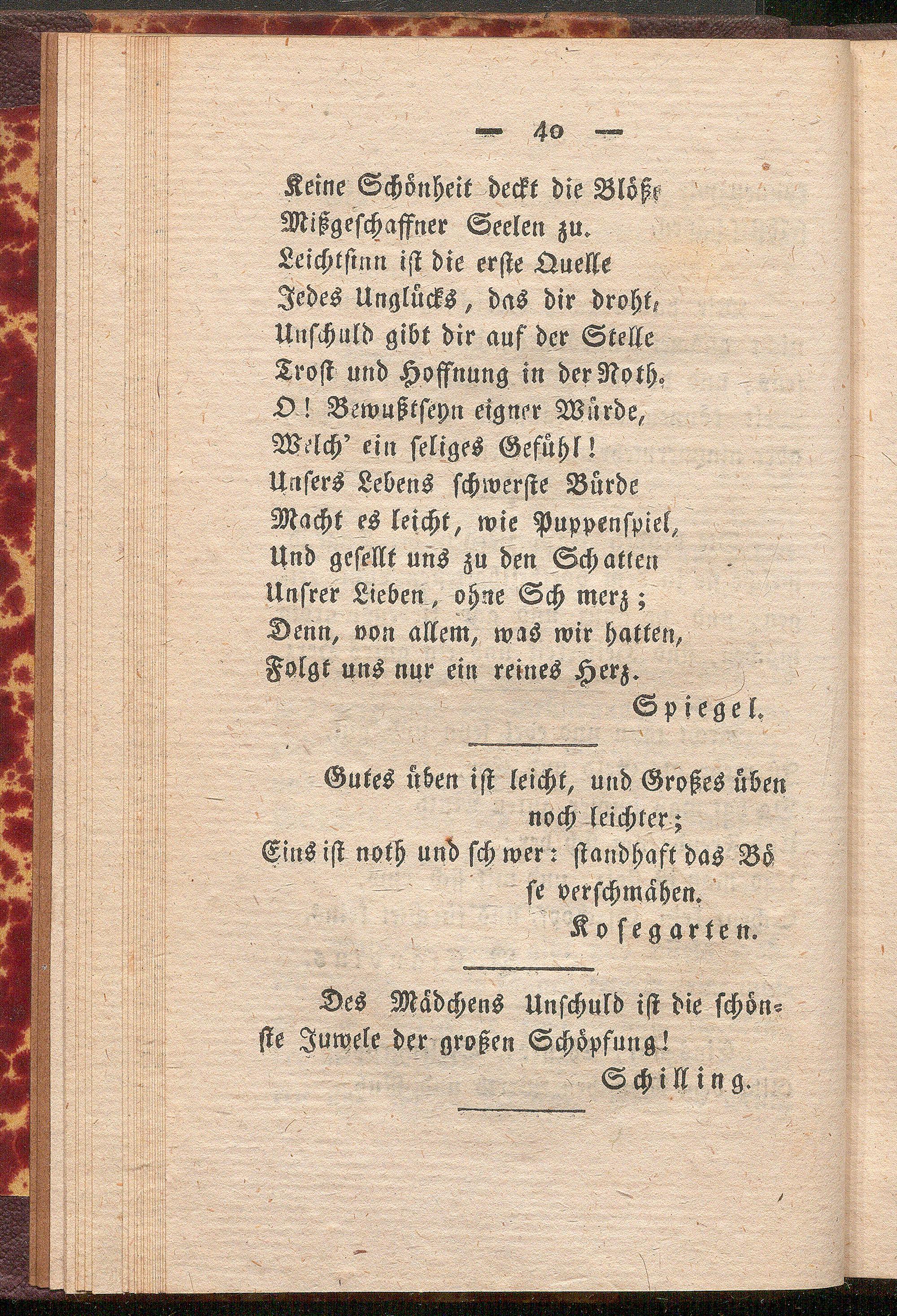 Blüthen aus dem Gebiethe der Lebensphilosophie und des Schönen : oder Auswahl der besten und schönsten Stellen aus den Werken Wielands, Göthes, Schillers, Lessings, Klopstocks, Herders und anderer berühmter Schriftsteller