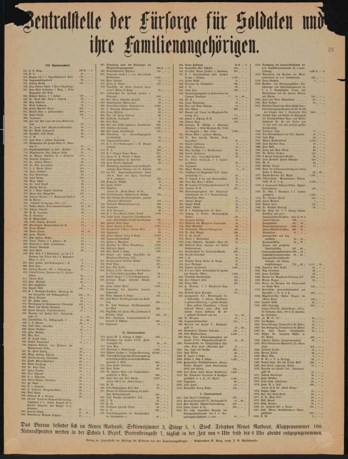 Zentralstelle der Fürsorge für Soldaten und ihre Familienangehörigen. VIII. Spendenausweis. 751. J.A. Kluge ... 200 K ... 1082 ... Das Bureau befindet sich im Neuen Rathause