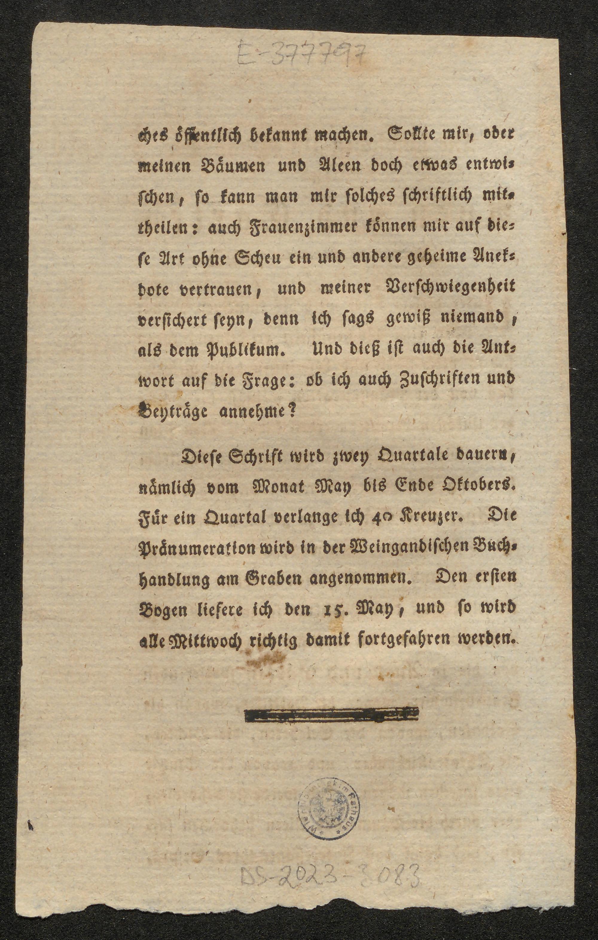 Die ländlichen Unterhaltungen in Auen und Gärten : Unter diesem Titel wird bis künftigen Monat May eine Wochenschrift erscheinen, wenn sich so viele Leser und Leserinnen dazu melden, daß von der Pränumeration wenigst die Hälfte der Unkösten bezahlet werden kann ... ; Diese Schrift wird zwey Quartale dauern, nämlich vom Monat May bis Ende Oktobers. Für ein Quartal verlange ich 40 Kreuzer. Die Pränumeration wird in der Weingandischen Buchhandlung am Graben angenommen. Den ersten Bogen liefere ich den 15. May, und so wird alle Mittwoch richtig damit fortgefahren werden