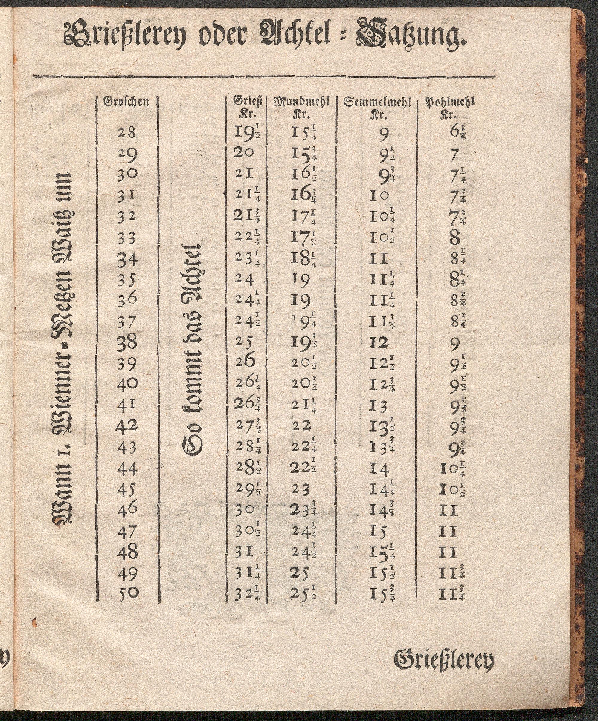 Mehl- und Brod-Satzung : so nach der Wienner-Maaß mit Unterscheid deren Körner - und Mehl-Käuffen über Abzug aller Unkösten und Beytrag des Burgerlichen zugelassenen Gewinns / außgerechnet und verfertiget worden durch Frantz Joseph Kollhundt/ des Innern Stadt-Raths und Metzenleyher