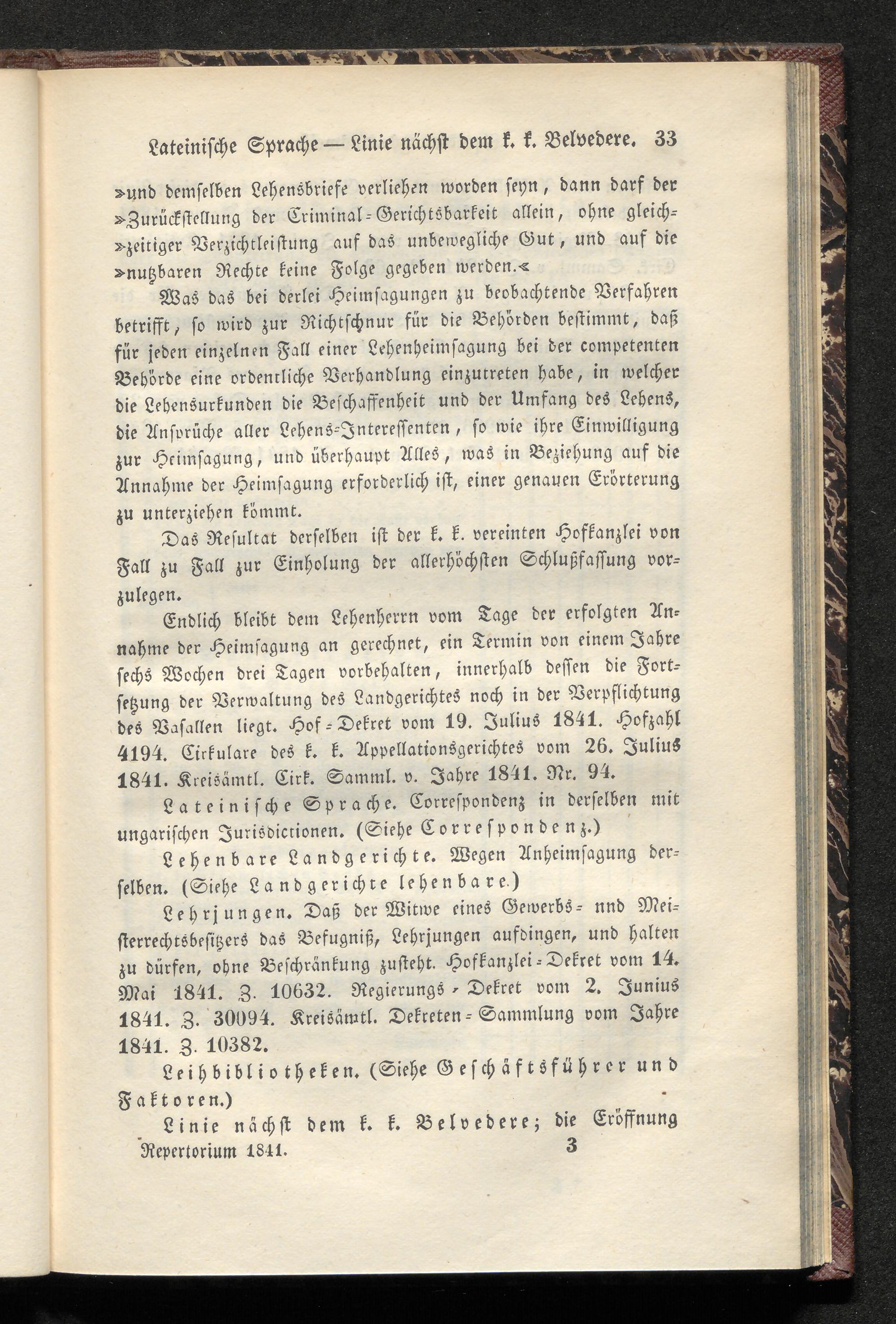Repertorium sämmtlicher im Jahre 1841 für die Provinz Nieder-Oesterreich von den höchsten Hofstellen, der k.k. n. ö. Landes-Regierung und dem k. k. Appellations-Gerichte erlassenen Gesetze und Verordnungen in vollständigen Auszügen, mit Angabe der Behörde, von welcher jede Verordnung erflossen ist, dann des Datums und der Zahl der letzteren ; In alphabetisch-chronologischer Ordnung / Geschöpft aus authentischen Quellen und zusammengestellt von dem k. k. Kreis-Protokollisten Gochnat, im V. u. M. B.