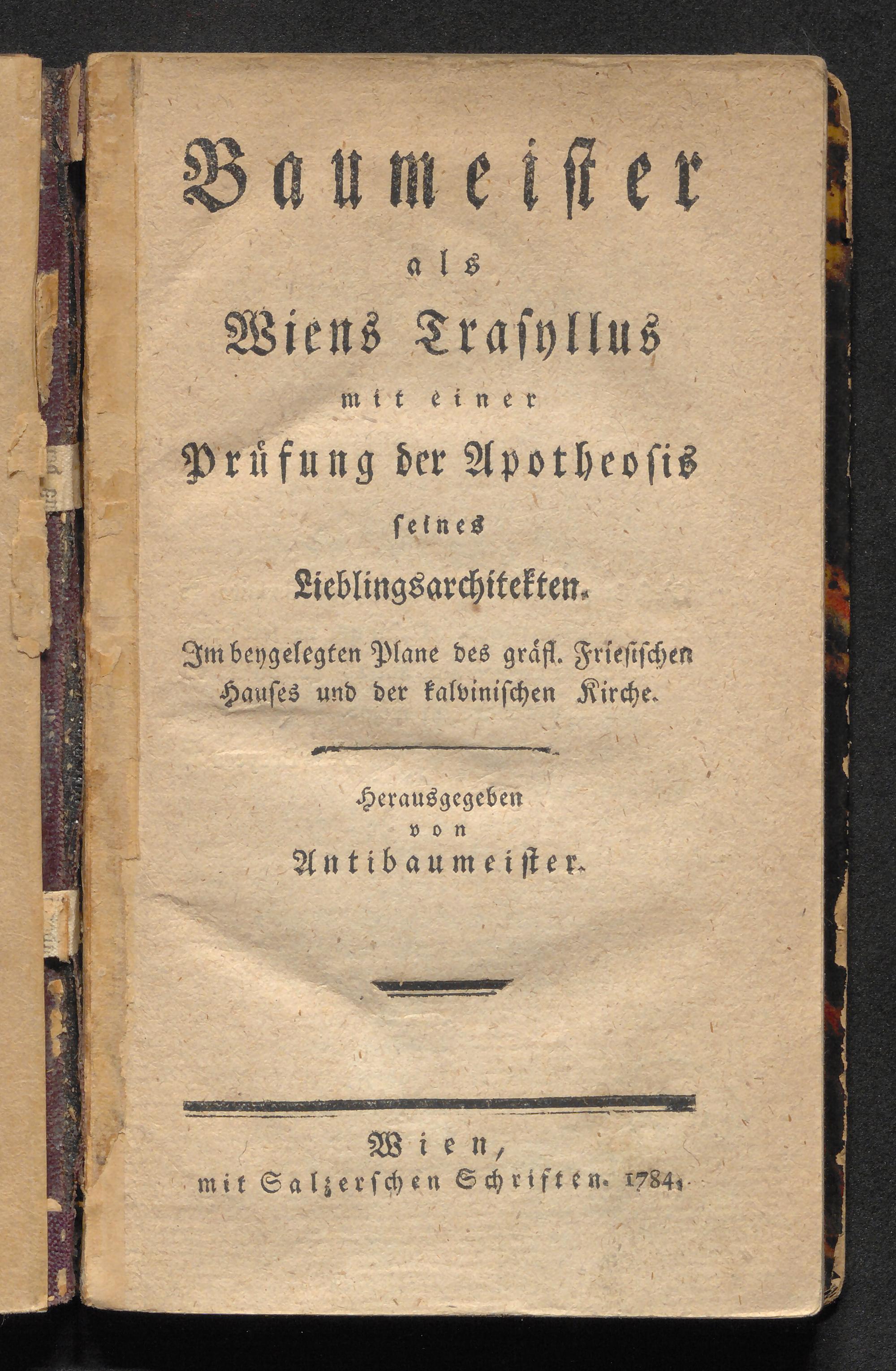 Baumeister als Wiens Trasyllus, mit einer Prüfung der Apotheosis seines Lieblingsarchitekten : Im beygelegten Plane des gräfl. Friesischen Hauses und der Kalvinischen Kirche / herausgegeben von Antibaumeister