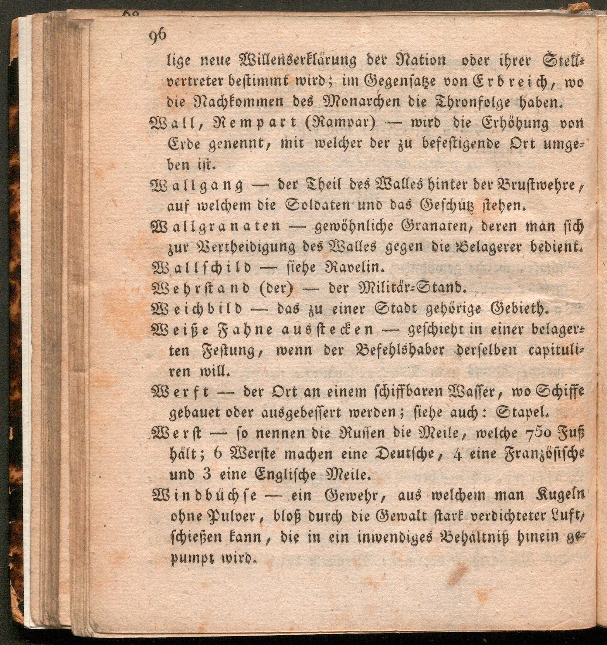 Compendiöses militärisch-politisches Taschenwörterbuch für die Leser des Oesterreichischen Beobachters, der Wiener-Zeitung und anderer politischer Journale unt Zeit-Piecen : oder faßlich erklärende alphabetische Uebersicht der wesentlichen im Land- und Seekriege etc. vorkommenden fremden Worte, Kunstausdrücke, Bedeutungen und Begriffe etc. etc. ; A - Z / Von Rittgräff