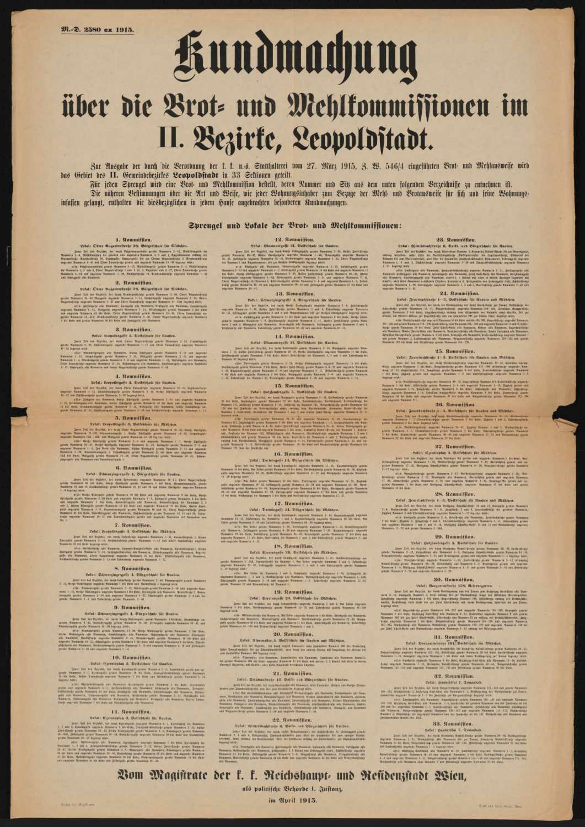 Kundmachung über die Brot= und Mehlkommissionen im II. Bezirke, Leopoldstadt ... Vom Magistrate der k.k. Reichshaupt= und Residenzstadt Wien ... [April 1915] ... M. D. 2580 ex 1915; Z. W. 546/4