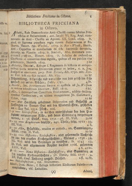 Catalogus Bibliothecae Frikianae : i. e. Apparatus Librorum quos a b. Parente cel. Joanne Frikio olim Eccles. Ulm. Antistite cet. hereditario iure acceptos insigniter & maximam partem adauxit Filius M. Albertus Frikius b. m. quondam in S. T. ibid. Ecclesiastes &c. ; quique nunc Augustæ Vindelicorum a Die XVI. Februarii MDCCLXXVIII. auctionis lege distrahentur