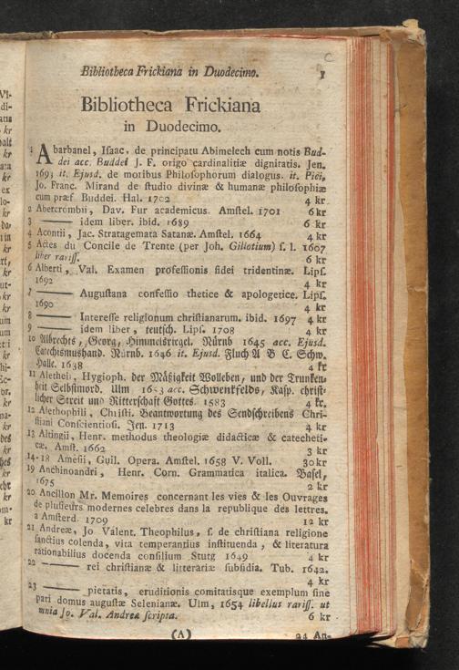 Catalogus Bibliothecae Frikianae : i. e. Apparatus Librorum quos a b. Parente cel. Joanne Frikio olim Eccles. Ulm. Antistite cet. hereditario iure acceptos insigniter & maximam partem adauxit Filius M. Albertus Frikius b. m. quondam in S. T. ibid. Ecclesiastes &c. ; quique nunc Augustæ Vindelicorum a Die XVI. Februarii MDCCLXXVIII. auctionis lege distrahentur