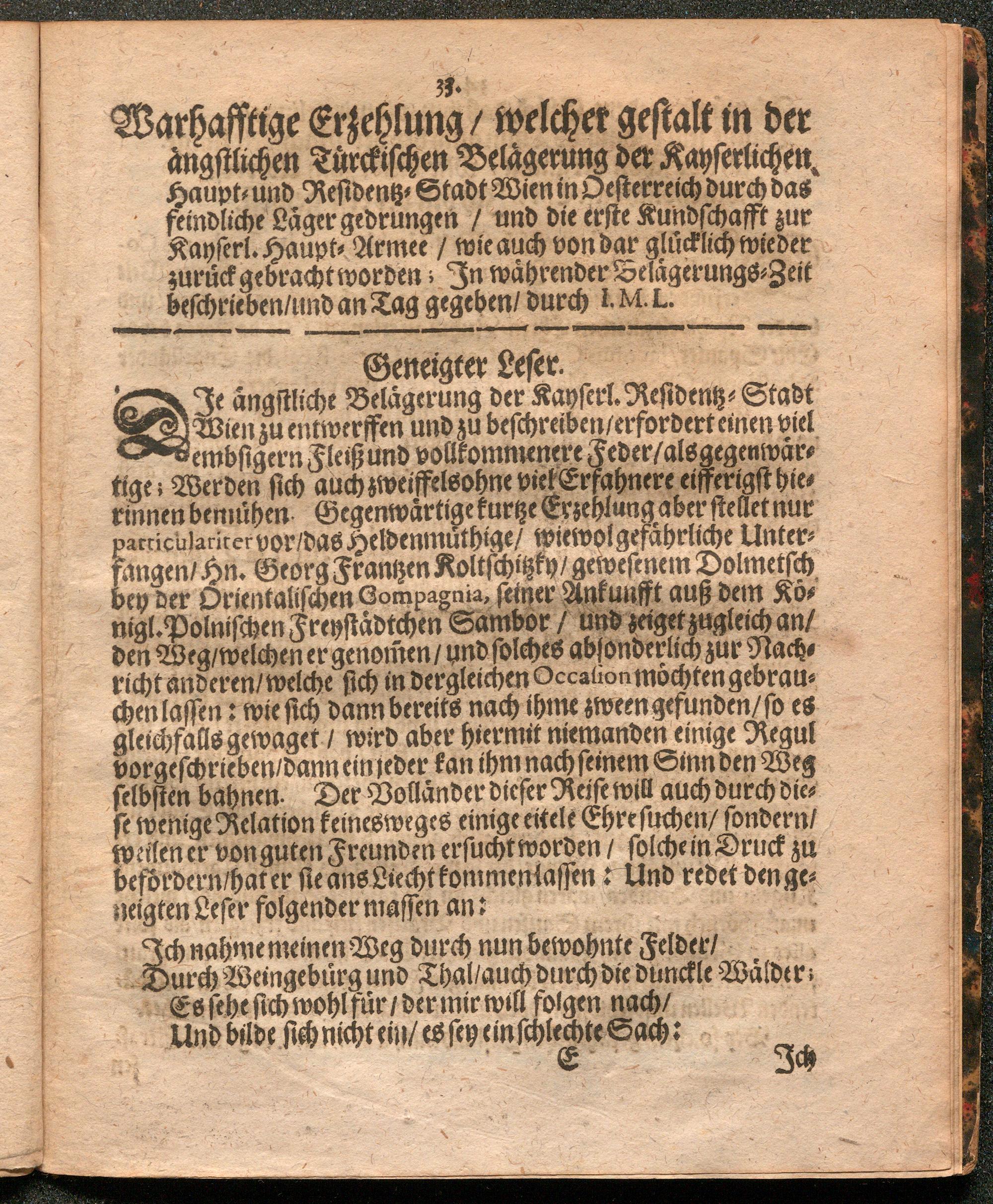 Glaubwürdiges Diarium und Beschreibung Dessen Was Zeit wehrender Türckischen Belägerung der Käyserl. Haupt- und Residenz-Stadt Wien vorgangen : Wobey Eine warhaffte Erzehlung, welcher Gestalt der vor diesem gewesene Dolmetsch der Orientalischen Compagnie, Namens Herr Georg Frantz Koltschitzky, ein gebohrner Pohl, auß dem Freystädlein Sambor, sich nebenst einem Diener, mit grosser Gefahr auß Wien durch das Türckische Läger gewagt, und glücklich bey der Käyserl. Lothringischen Armee und anderer Orten seine Geschäffte verrichtet, und wieder in Wien ankommen / Von einem Käyserl. Officier, so sich von Anfang biß zu End darinnen befunden, warhafftig verzeichnet und zusammen getragen