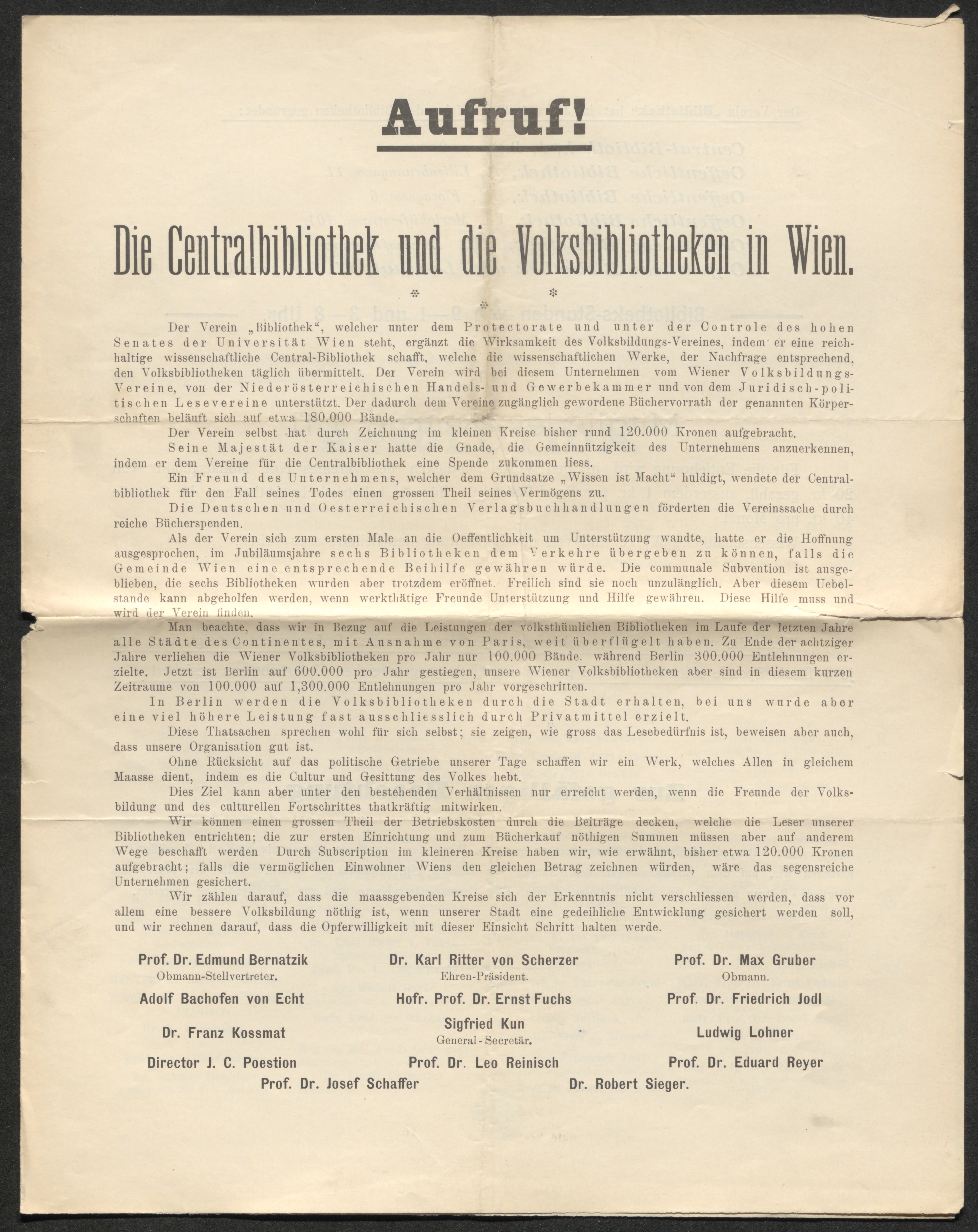 Aufruf! Die Centralbibliothek und die Volksbibliotheken in Wien : Der Verein "Bibliothek", welcher unter dem Protectorate ... / Edmund Bernatzik ...