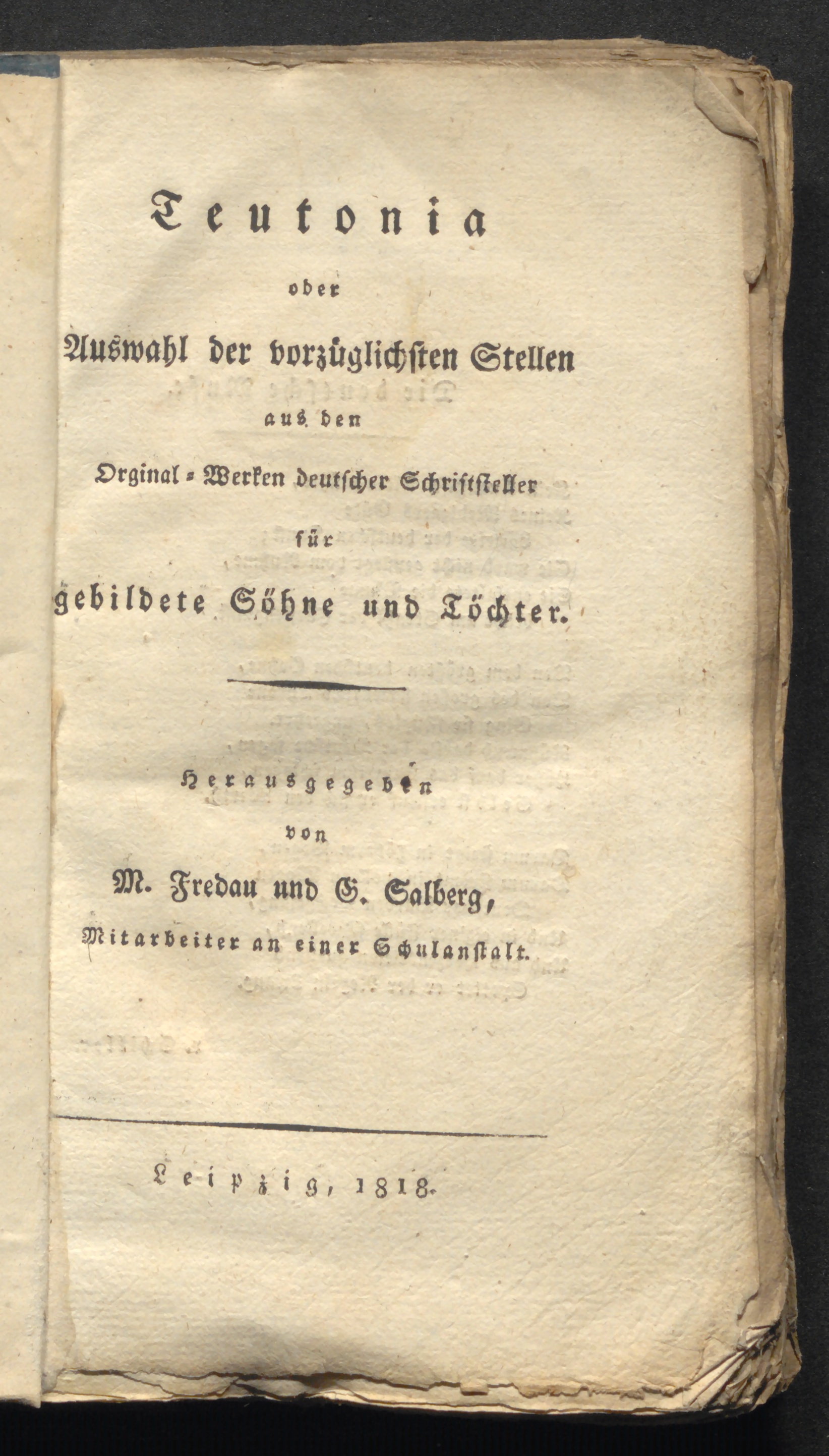 Teutonia oder Auswahl der vorzüglichsten Stellen aus den Original-Werken deutscher Schriftsteller für gebildete Söhne und Töchter / Herausgegeben von M. Fredau [i.e. Maimon Fraenkel] und G. Salberg [i.e. Gotthold Salomon], Mitarbeiter an einer Schulanstalt