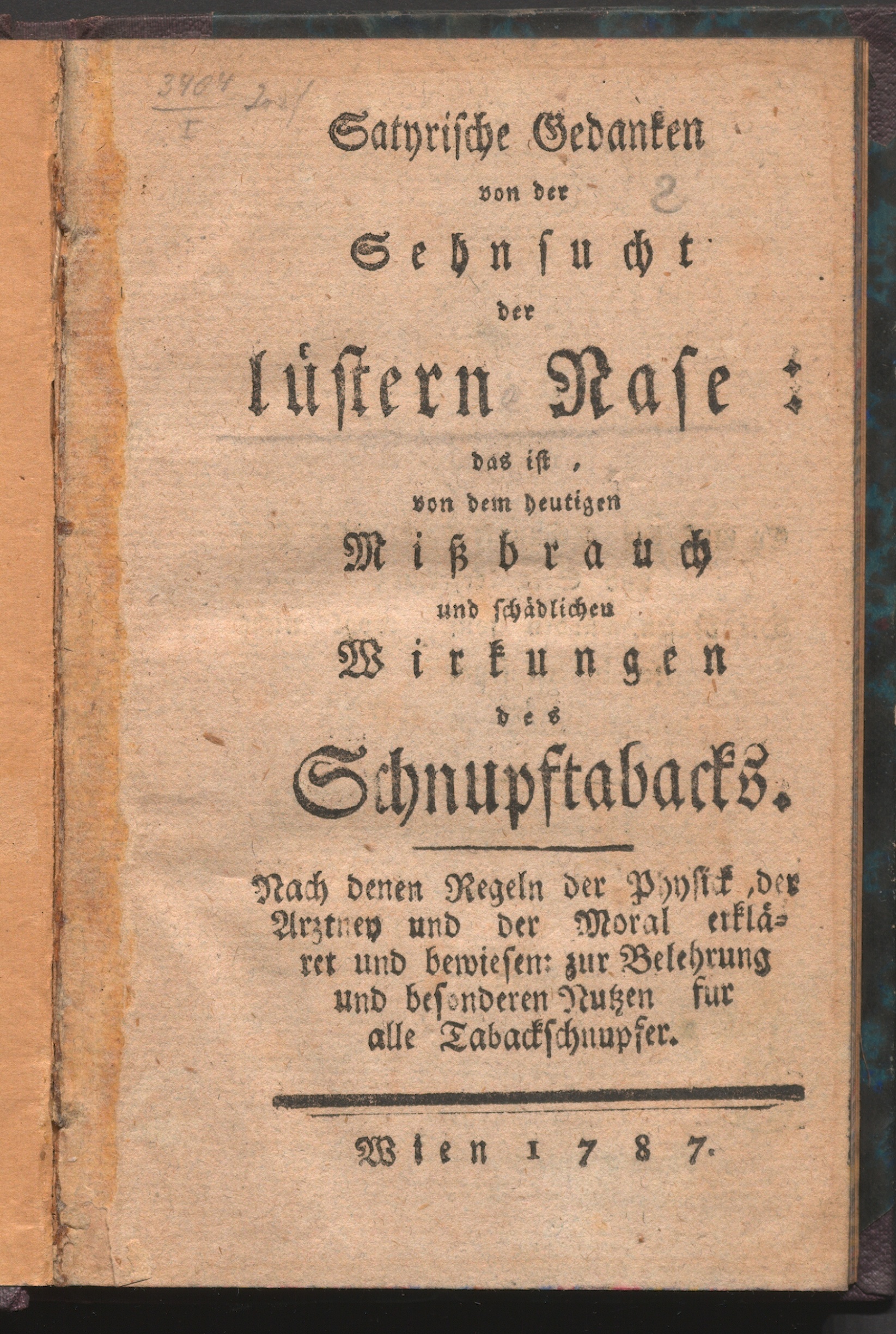 Satyrische Gedanken von der Sehnsucht der lüstern Nase: das ist, von dem heutigen Missbrauch und schädlichen Wirkungen des Schnupftabacks : Nach denen Regeln der Physick, der Arztney und der Moral erkläret und bewiesen: zur Belehrung und besonderen Nutzen für alle Tabackschnupfer