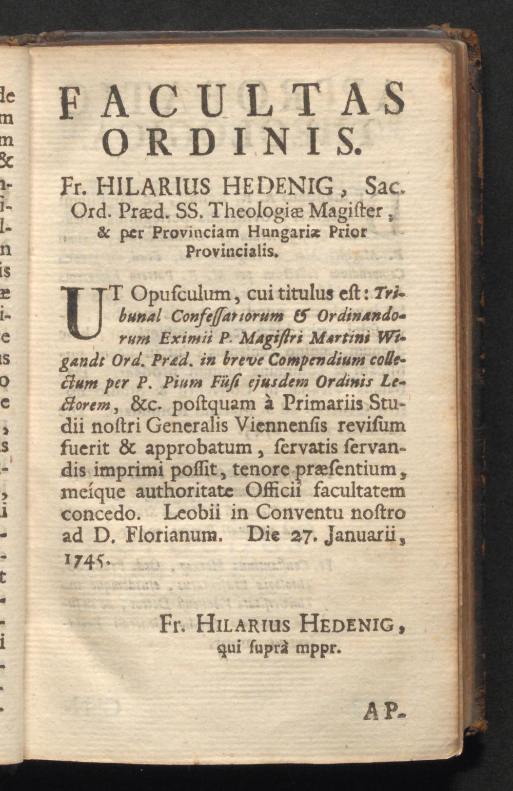 Tribunal Confessariorum Et Ordinandorum Eximii Patris Magistri Martini Wigandt, Ordinis Prædicatorum : In quo Usitatores Theologiæ moralis materiæ juxta probabiliora ac inconcussa Angelici & Quinti Ecclesiæ Doctoris D. Thomæ Aquinatis ... pertractantur ... Accedunt Propositiones ab Alex. VII. & VIII. ac Innoc. XI. damnatæ. Item specialis Manuductio Examinandorum ... / In Breve Compendium Collectum Per P. Pium Füsi, Ejusdem Ordinis Lectorem