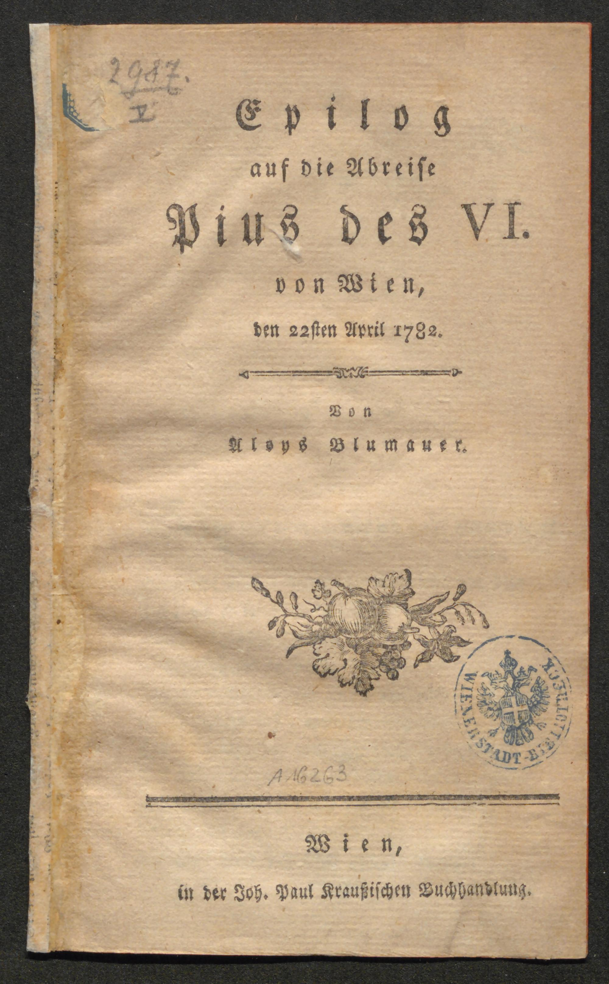 Epilog auf die Abreise Pius des VI. von Wien, den 22sten April 1782 / Von Aloys Blumauer