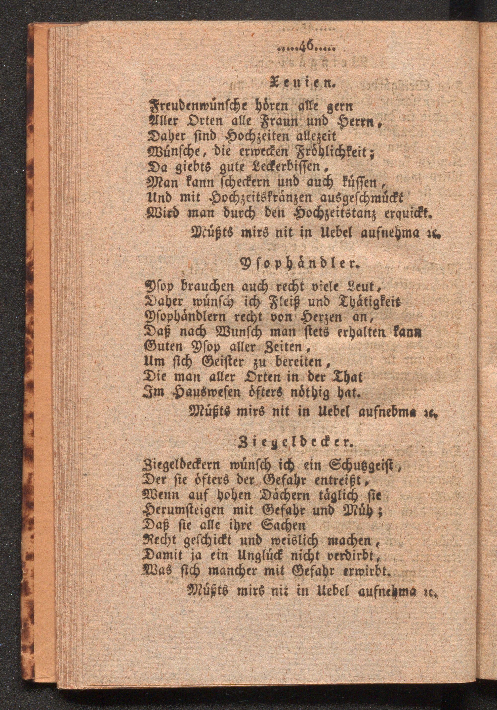 Der lustige Neujahrs-Gratulant, oder ganz neu verfaßte und wohlpassende Neujahrswünsche, Personen von verschiedenen Ständen gewidmet. : Rach alphabetischer Ordnung eingetheilt, und im Volkstone zum Singen eingerichtet nach der bekannten Arie: Müßts ma nix in Uebel aufnehma etc.