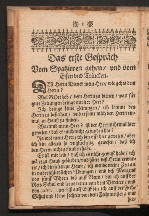 Teutsche und Italianische Discurs : sambt Etlichen Proverbien Historien vnd Fabeln / zusammen getragen durch Stephanum Barnabe, Ihro Kayserliche Mayest. vnd Ertz-Hertzogl. Curchl. Edel-Knaben Sprachmeister