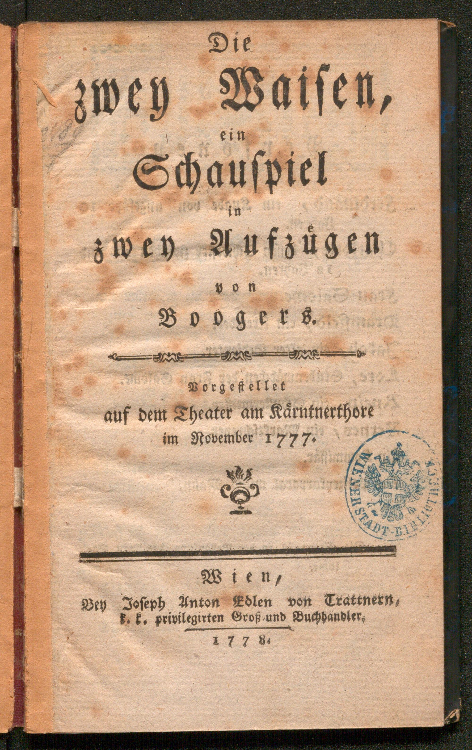 Die zwey Waisen : ein Schauspiel in zwey Aufzügen : Vorgestellet auf dem Theater am Kärtnerthore im November 1777 / von Boogers