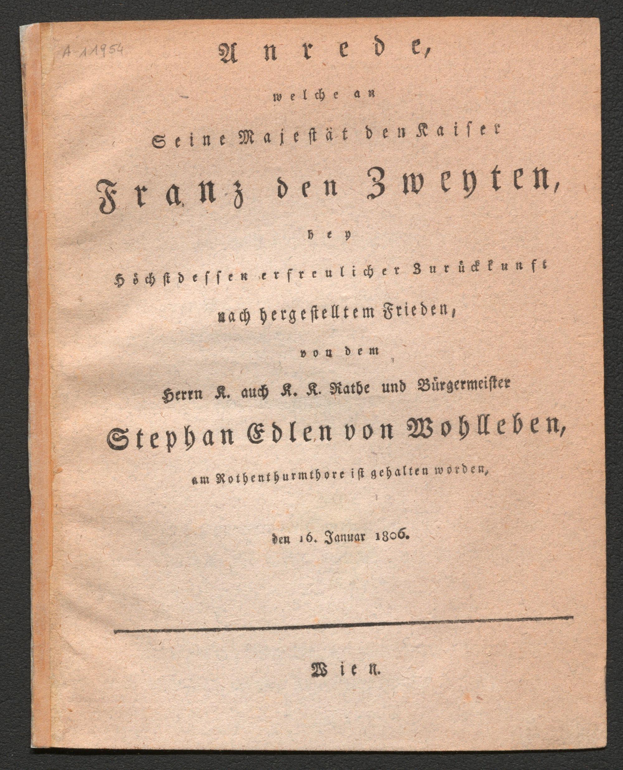 Anrede, welche an Seine Majestät den Kaiser Franz den Zweyten bey Höchstdessen erfreulicher Zurückkunft nach hergestelltem Frieden, von dem Herrn K. auch K. K. Rathe und Bürgermeister Stephan von Wohlleben, am Rothenthurmthore ist gehalten worden, den 16. Januar 1806.