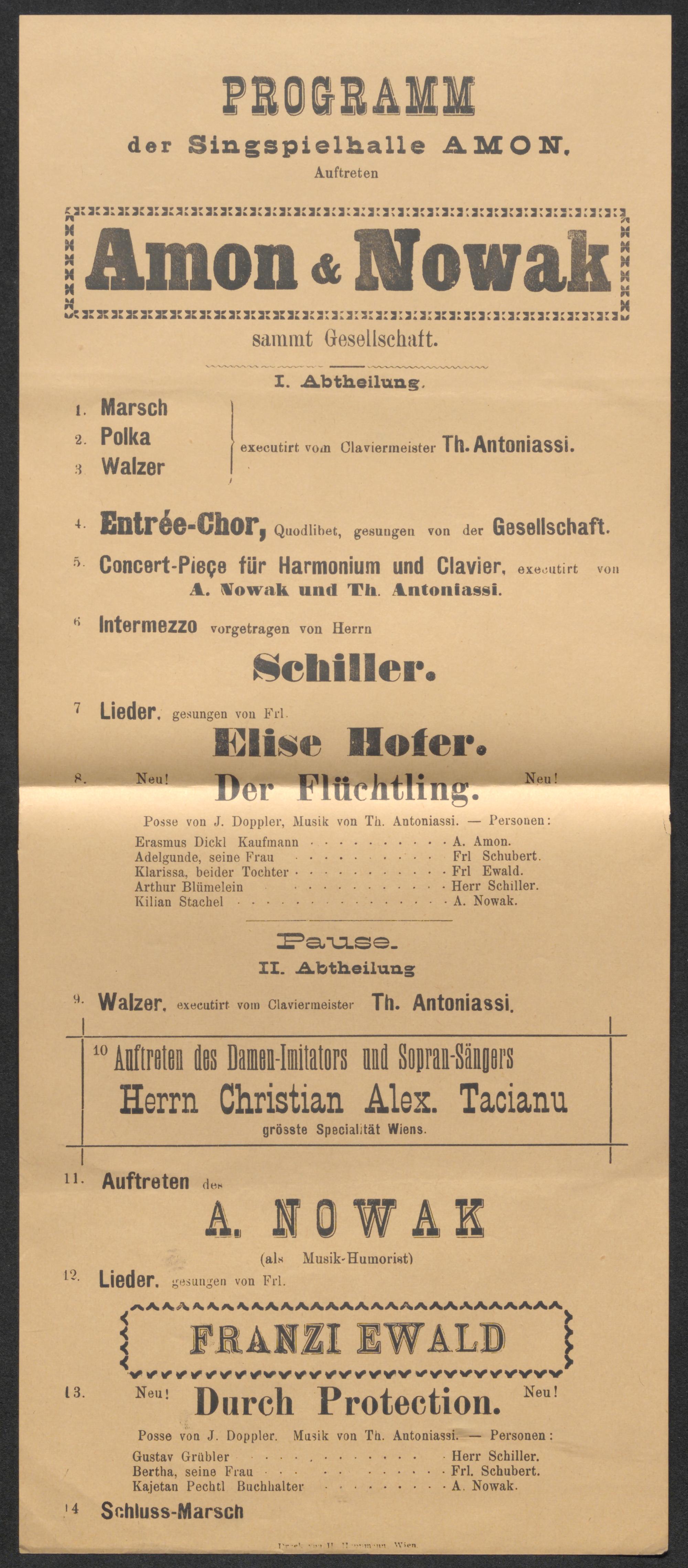 Programm der Singspielhalle Amon. Auftreten Amon & Nowak sammt Gesellschaft : 1. Abtheilung. 1. Marsch, 2. Polka, 3. Walzer, executirt vom Claviermeister Th. Antoniassi ... ; 8. Neu! Der Flüchtling. Posse von J. Doppler ...