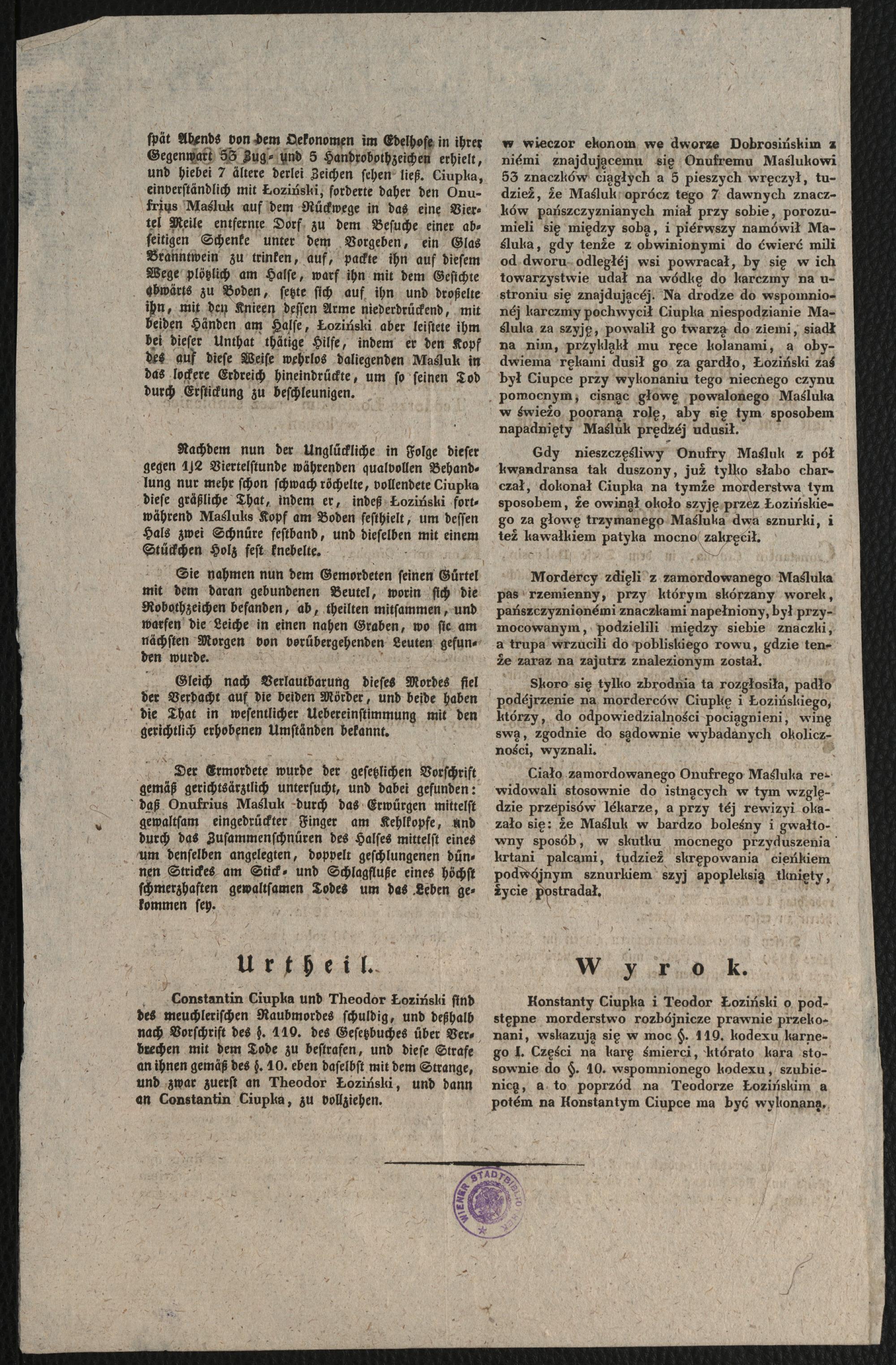 Todesurtheil, welches von dem k.k. Lemberger Strafgerichte über die mit Constantin Ciupka und Theodor Lozinski, wegen des Verbrechens des Raubmordes abgeführte Criminal-Untersuchung geschöpft, und in Folge der von den hohen und höchsten Justiz-Behörden herabgelangten Bestätigung am 25. Februar 1841 in Lemberg mit dem Strange vollzogen worden ist