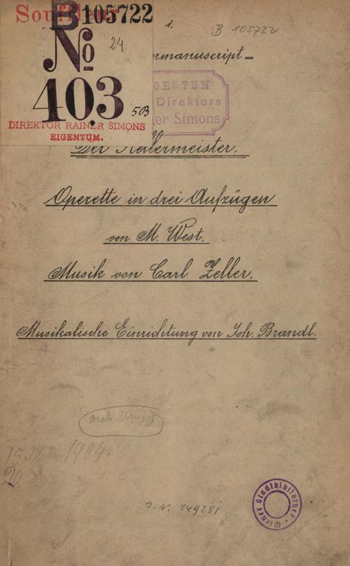Der Kellermeister : Operette in drei Aufzügen / von M. West. Musik von Carl Zeller. Musikalische Einrichtung von Joh. Brandl. [S.l.] : [s.n.], [1904]. Wienbibliothek im Rathaus, B-105722, https://resolver.obvsg.at/urn:nbn:at:AT-WBR-38014 / Public Domain Mark 1.0