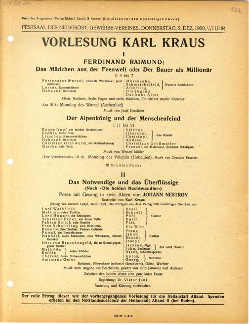 Programm im Festsaal des Niederösterreichischen Gewerbe-Vereins: Ferdinand Raimund: Das Mädchen aus der Feenwelt oder Der Bauer als Millionär; Der Alpenkönig und der Menschenfeind | Johann Nestroy: Das Notwendige und das Überflüssige (Nach "Die beiden Nachtwandler"). Posse mit Gesang in zwei Akten