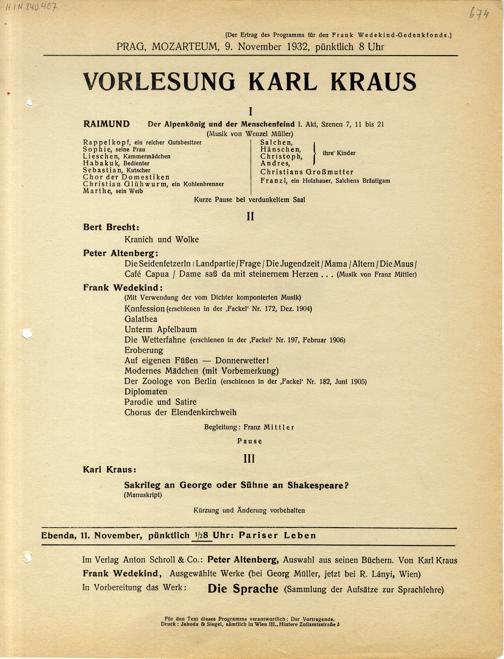 Programm im Mozarteum: Raimund - Der Alpenkönig und der Menschenfeind I, 7, 11 bis 21 | Bert Brecht: Kranich und Wolke | Peter Altenberg: Die Seidenfetzerln; Landpartie; Frage; Die Jugendzeit; Mama; Altern; Die Maus; Café Capua; Dame saß da mit steinernem Herzen... | Frank Wedekind: Konfession; Galathea; Unterm Apfelbaum; Die Wetterfahne; Eroberung; Auf eigenen Füßen - Donnerwetter!; Modernes Mädchen (mit Vorbemerkung); Der Zoologe von Berlin; Diplomaten; Parodie und Satire; Chorus der Elendenkirchweih | Karl Kraus: Sakrileg an George oder Sühne an Shakespeare? (Manuskript)