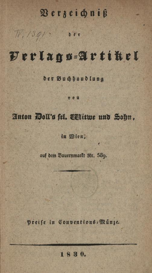 Anton Doll's sel. Wittwe: Verzeichniß der Verlags-Artikel der Buchhandlung von Anton Doll's sel. Witwe und Sohn, in Wien, auf dem Bauernmarkt Nr. 589. [Wien] : Gedruckt bey Ant. v. Haykul, 1830. Wienbibliothek im Rathaus, A-16458, https://resolver.obvsg.at/urn:nbn:at:AT-WBR-48761 / Public Domain Mark 1.0