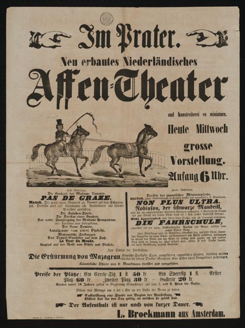 Im Prater. Neu erbautes Niederländisches Affen-Theater und Kunstreiterei en miniature : Heute Mittwoch grosse Vorstellung / L. Broekmann aus Amsterdam. [Wien] : Gedruckt bei J. Stöckholzer v. Hirschfeld, [1862?]. Wienbibliothek im Rathaus, D-79738, https://resolver.obvsg.at/urn:nbn:at:AT-WBR-55336 / Public Domain Mark 1.0