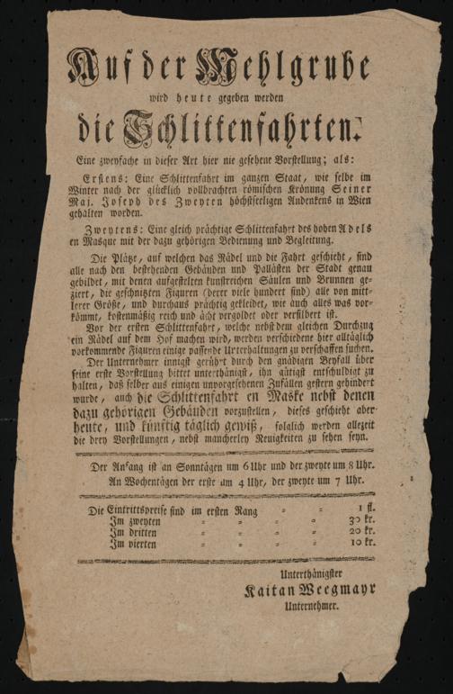 Auf der Mehlgrube wird heute gegeben werden die Schlittenfahrten : Eine zweyfache in dieser Art hier nie gesehene Vorstellung; als: Erstens: Eine Schlittenfahrt im ganzen Staat, wie selbe im Winter nach der glücklich vollbrachten [...] / Unterthänigster Kaitan Weegmayr Unternehmer. [Wien] : [Weegmayr], [1790?]. Wienbibliothek im Rathaus,