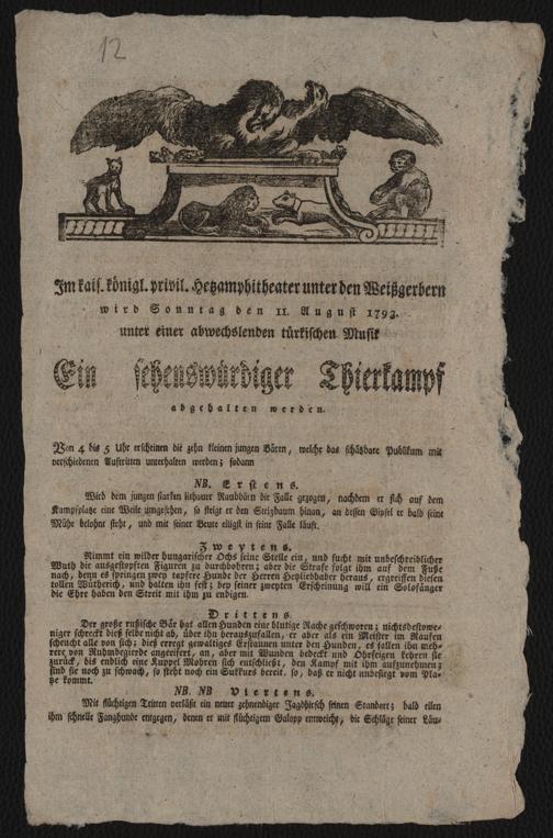 K.K. Hetzpachtung: Im kais. königl. privil. Hetzamphitheater unter den Weißgerbern wird Sonntag den 11. August 1793. unter einer abwechslenden türkischen Musik Ein sehenswürdiger [...] : Der Anfang ist mit dem Schlag 5 Uhr. [Wien] : [Verlag nicht ermittelbar], 11.8.1793. Wienbibliothek im Rathaus, C-16361, https://resolver.obvsg.at/urn:nbn:at:AT-WBR-58924 / Public Domain Mark 1.0