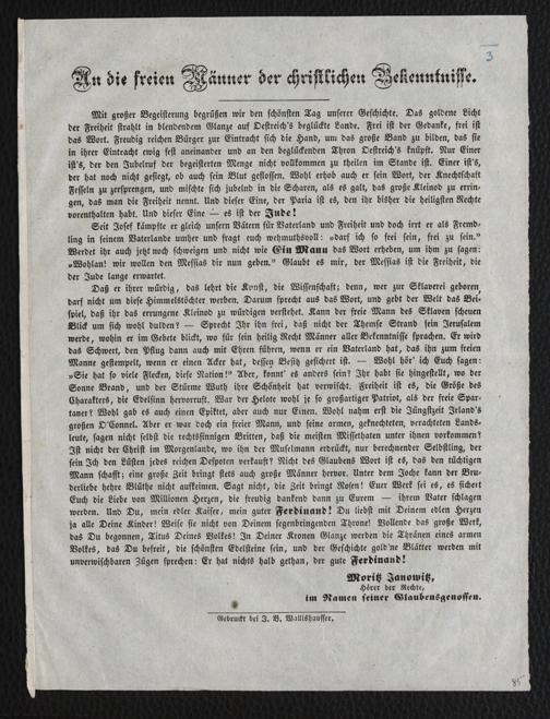 An die freien Männer der christlichen Bekenntnisse / Moritz Janowitz, Hörer der Rechte, im Namen seiner Glaubensgenossen. [Wien] : Gedruckt bei J. B. Wallishausser, [s.a. 1848]. Wienbibliothek im Rathaus, Ra-121, https://resolver.obvsg.at/urn:nbn:at:AT-WBR-61757 / Public Domain Mark 1.0
