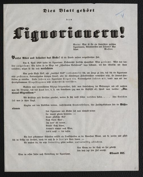Dies Blatt gehört den Liguorianern! : Wien im ersten Jahr nach Vertreibung der Liguorianer / Eduard Ldf. [S.l.], [s.a. 1848]. Wienbibliothek im Rathaus, Ra-307, https://resolver.obvsg.at/urn:nbn:at:AT-WBR-62995 / Public Domain Mark 1.0