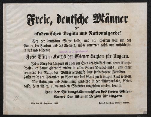 Freie, deutsche Männer der akademischen Legion und Nationalgarde! : Wer der deutschen Sache hold, und sich scharren [!] will um das Panier der Freiheít und des Rechtes, möge eintreten rasch und entschlossen in das sich [...] / Von der Bildungs-Kommission des freien Eliten-Korps der Wiener Legion für Ungarn. [Wien] : Gedruckt bei Franz Edlen von Schmid, 1848. Wienbibliothek im Rathaus,