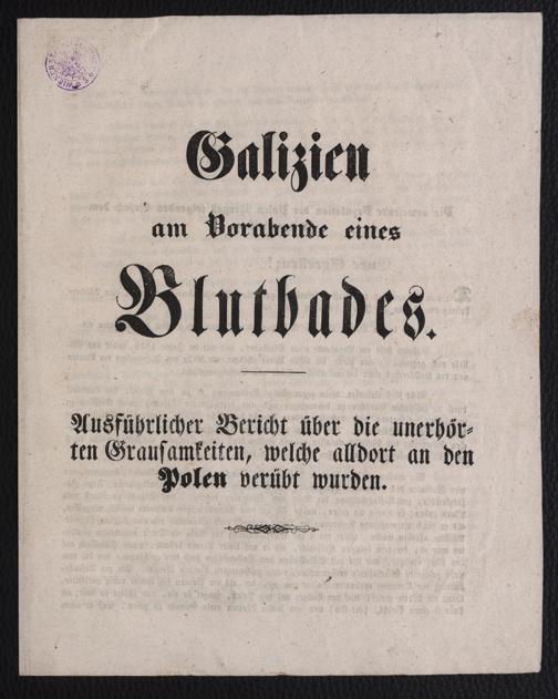 Galizien am Vorabende eines Blutbades : Ausführlicher Bericht über die unerhörten Grausamkeiten, welche alldort an den Polen verübt wurden ... ; [Wien am 5. Mai 1848 ; Im Namen der polnischen [...]. [Wien] : Gedruckt bei Ant. Benko, 1848. Wienbibliothek im Rathaus, Ra-342, https://resolver.obvsg.at/urn:nbn:at:AT-WBR-65550 / Public Domain Mark 1.0