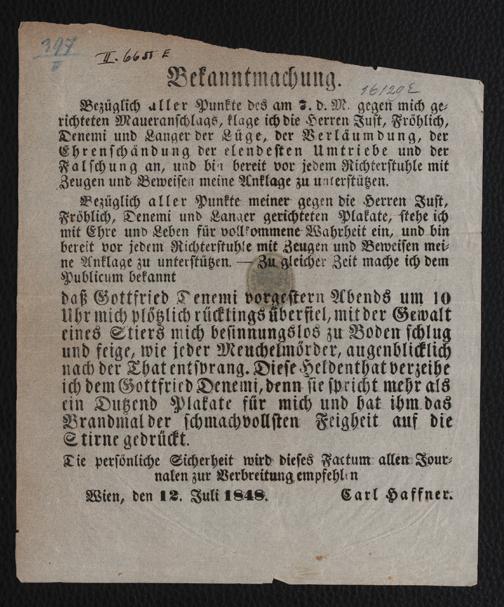 - QuellenangabeBekanntmachung. Bezüglich aller Punkte des am 7. d. M. gegen mich gerichtetet Maueranschlags, klage ich die Herren Just, Fröhlich, Denemi und Langer der [...] : und bin bereit vor jedem Richterstuhle mit Zeugen und Beweisen meine Anklage zu unterstützen ... ; Wien, den 12. Juli 1848 / Carl Haffner. [S.l.], 1848. Wienbibliothek im Rathaus, Ra-1065, https://resolver.obvsg.at/urn:nbn:at:AT-WBR-69556 / Public Domain Mark 1.0
