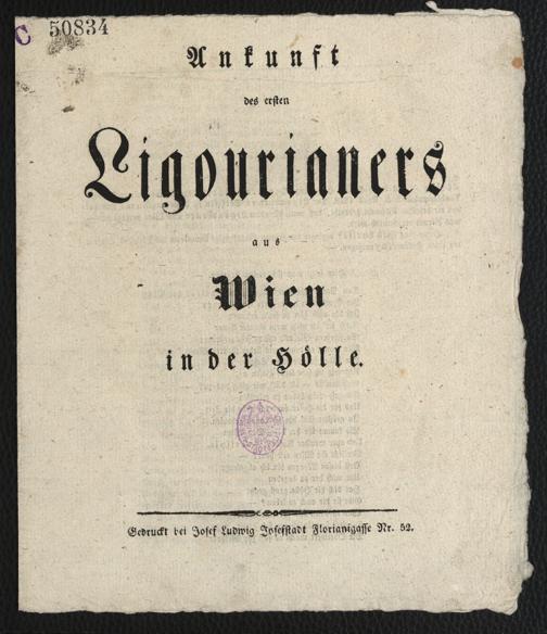Ankunft des ersten Ligourianers aus Wien in der Hölle / [Arthur]. [Wien] : Gedruckt bei Josef Ludwig Josefstadt Florianigasse Nr. 52, [s.a. 1848]. Wienbibliothek im Rathaus, Ra-981, https://resolver.obvsg.at/urn:nbn:at:AT-WBR-70636 / Public Domain Mark 1.0