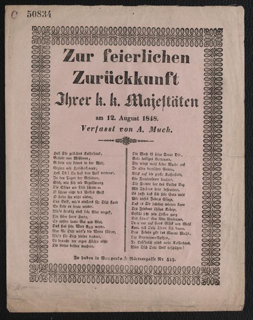 Zur feierlichen Zurückkunft Ihrer k. k. Majestäten am 12. August 1848 / A. Much. [Wien], 1848. Wienbibliothek im Rathaus, Ra-1354, https://resolver.obvsg.at/urn:nbn:at:AT-WBR-72473 / Public Domain Mark 1.0