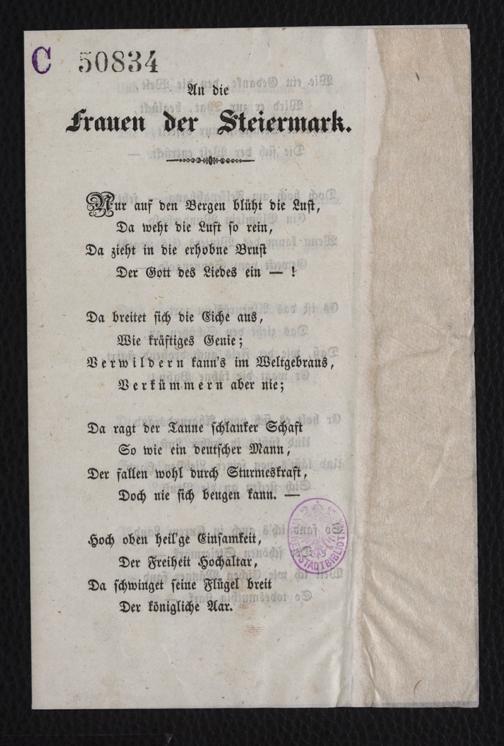 An die Frauen der Steiermark / [Friedrich Kaiser]. Gratz : Gedruckt bei A. Leykam's Erben, [s.a. ca. 1848]. Wienbibliothek im Rathaus, Ra-1283, https://resolver.obvsg.at/urn:nbn:at:AT-WBR-73411 / Public Domain Mark 1.0
