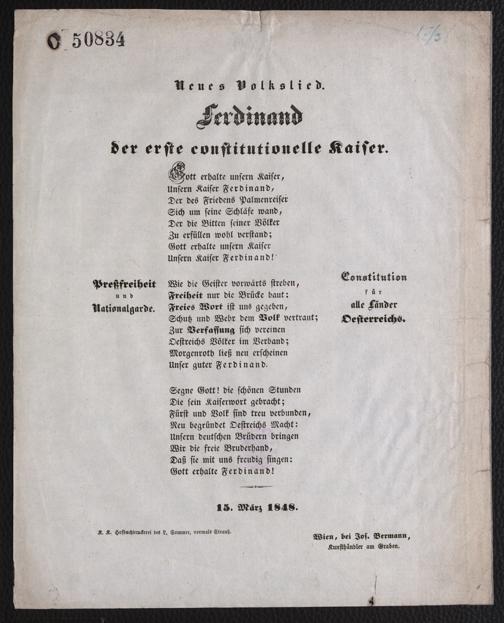 Neues Volkslied. Ferdinand der erste constitutionelle Kaiser : 15. März 1848. Wien : K. K. Hof-Buchdruckerei des L. Sommer [...]
