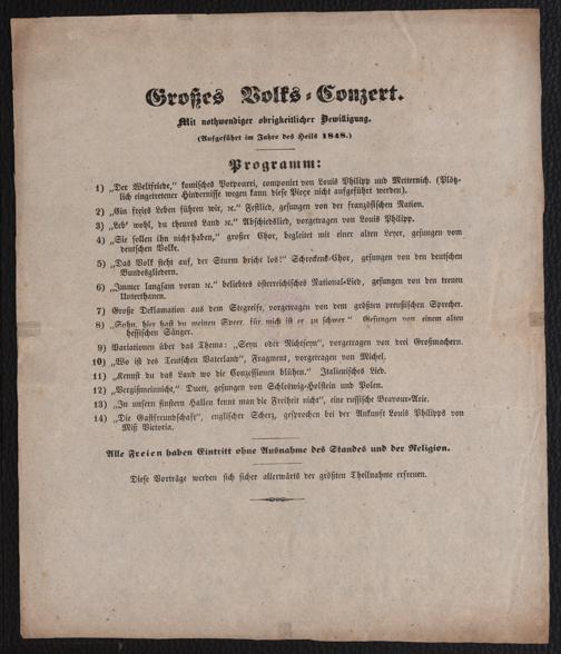 Großes Volks-Conzert : Mit nothwendiger obrigkeitlicher Bewilligung. (Aufgeführt im Jahre des Heils 1848.). [S.l.], 1848. Wienbibliothek im Rathaus, Ra-4672, https://resolver.obvsg.at/urn:nbn:at:AT-WBR-76434 / Public Domain Mark 1.0