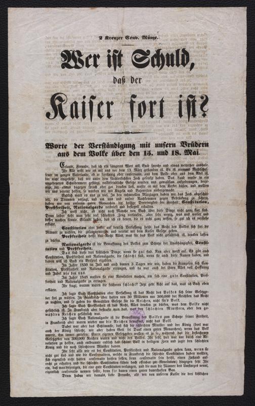 Wer ist Schuld, daß der Kaiser fort ist? : Worte der Verständigung mit unsern Brüdern aus dem Volke über den 15. und 18. Mai / [Brühl, Nationalgardist des Stubenviertels für Hunderttausende von Gleichgesinnten]. [Wien] : Gedruckt und zu haben bei U. Klopf sen. und Alex. Eurich, Wollzeile 782, 1848. Wienbibliothek im Rathaus, Rb-2121, https://resolver.obvsg.at/urn:nbn:at:AT-WBR-79981 / Public Domain Mark 1.0
