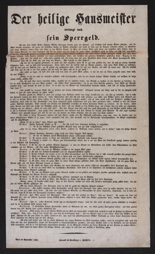 Der heilige Hausmeister verlangt auch sein Sperrgeld : Wien im September 1848. [Wien] : Gedruckt bei Stockhalzer [!] v. Hirschfeld, 1848. Wienbibliothek im Rathaus, Rb-2858, https://resolver.obvsg.at/urn:nbn:at:AT-WBR-88465 / Public Domain Mark 1.0