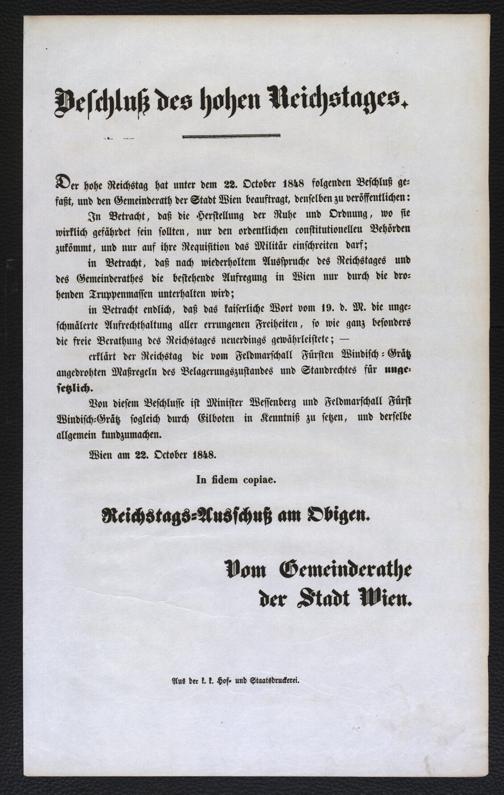 - TitelBeschluß des hohen Reichstages : Der hohe Reichstag hat unter dem 22. October 1848 folgenden Beschluß gefaßt, und den Gemeinderath der Stadt Wien beauftragt, denselben zu veröffentlichen: ... erklärt der Reichstag die vom Feldmarschall Fürsten Windisch-Grätz angedrohten Maßregeln des Belagerungszustandes und Standrechtes für ungesetzlich. Von diesem Beschlusse ist Minister Wessenberg und Feldmarschall Fürst Windisch-Grätz sogleich durch Eilboten in Kenntniß zu setzen, und derselbe allgemein kundzumachen ; Wien am 22. October 1848 / Reichstags-Ausschuß am Obigen. Vom Gemeinderathe der Stadt Wien