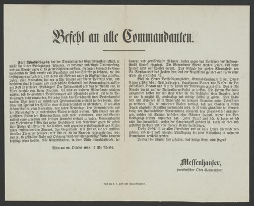 - TitelBefehl an alle Commandanten : Fürst Windischgrätz hat der Deputation des Gemeinderathes erklärt, er müsse bei seinen Bedingungen beharren, er verlange unbedingte Unterwerfung, und am Abende werde er die Feindseligkeiten eröffnen ... ; Wien am 26. October 1848. 5 Uhr Abends / Messenhauser, provisorischer Ober-Commandant