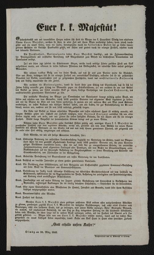 Euer k. k. Majestät! : Ehrfurchtsvollst und mit treuerfüllten Herzen nahten sich stets die Bürger der k. Hauptstadt Olmütz dem erhabenen Throne Eurer Majestät, welchen sie schon [...]. Olmütz : Buchdruckerei von A. Skarnitzl in Olmütz, 1848. Wienbibliothek im Rathaus, Rb-4938, https://resolver.obvsg.at/urn:nbn:at:AT-WBR-112088 / Public Domain Mark 1.0