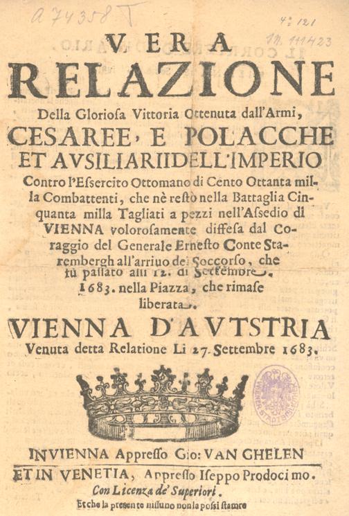 - QuellenangabeVera Relazione Della Gloriosa Vittoria Ottenuta dall'Armi Cesaree, E Polacche Et Avsiliarii Dell'Imperio Contro l'Essercito Ottomano di Cento Ottanta milla [...] : Venuta detta Relatione Li 27. Settembre 1683. Vienna : Appresso Gio. Van Ghelen ; Venetia : Appresso Iseppo Prodocimo, [1683]. Wienbibliothek im Rathaus, A-74358, https://resolver.obvsg.at/urn:nbn:at:AT-WBR-121287 / Public Domain Mark 1.0