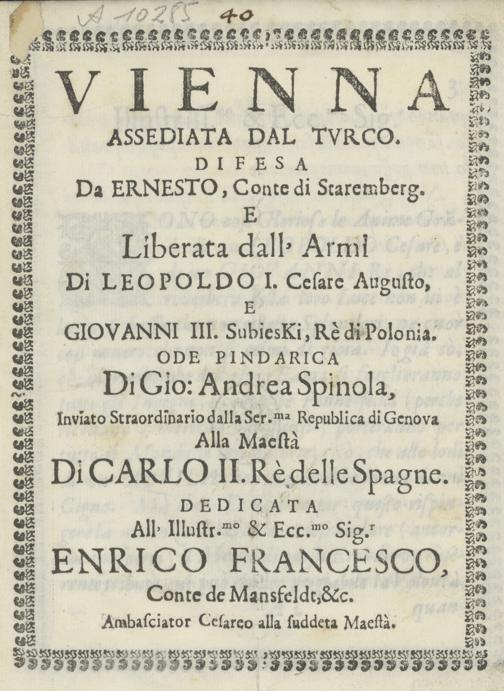 Vienna Assediata Dal Tvrco. Difesa Da Ernesto, Conte di Staremberg. E Liberata dall'Armi Di Leopoldo I. Cesare Augusto E Giovanni III. SubiesKi, Rè di [...] : Ode Pindarica ; [Madrid, 12. Decembre 1683] / Di Gio. Andrea Spinola, Inviato Straordinario dalla Ser.ma Republica di Genova Alla Maestà Di Carlo II. Rè delle Spagne. Dedicata All'Illustr.mo & Ecc.mo Sig.r Enrico Francesco, Conte de Mansfeldt, &c. Ambasciator Cesareo alla suddeta Maestà. [S.l.] : [s.n.], [ca. 1683]. Wienbibliothek im Rathaus,