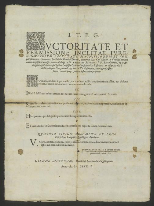 - QuellenangabeMurnius, Andreas: I. T. F. G. Avctoritate Et Permissione Inclitae Ivre-Consvltorvm Facvltatis Magnificorvm Et Consultißimorum Virorum, Spectabilis Domini Decani, Seniorum [...] : Dispvtabvntvr In Eodem Ivris-consultorum Collegio 22. Martij hora prima pomeridiana, Anno 1584. Vienne Austriæ : Excudebat Leonhardus Naßingerus, 22.3.1584. Wienbibliothek im Rathaus, C-79740, https://resolver.obvsg.at/urn:nbn:at:AT-WBR-126097 / Public Domain Mark 1.0