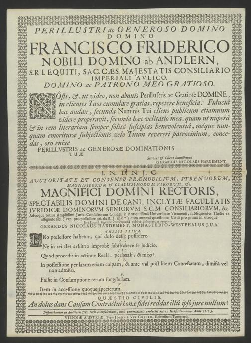 - QuellenangabeI. N. D. N. I. C. Auctoritate Et Consensu Prænobilium, Strenuorum, Magnificorum & Clarissimorum Virorum, &c. Magnifici Domini Rectoris, Spectabilis Domini [...] : Disputabuntur in Auditorio DD. Iuris-Consultorum, horis pomeridianis consuetis die ... Mensis ... Anno 1679 / Gerardus Nicolaus Hardement, Monasterio-Westphalus J. U. A. Viennæ Austriæ : Typis Joannis Van Ghelen, Universitatis Typographi, 12.1.1679. Wienbibliothek im Rathaus, C-79740, https://resolver.obvsg.at/urn:nbn:at:AT-WBR-126328 / Public Domain Mark 1.0