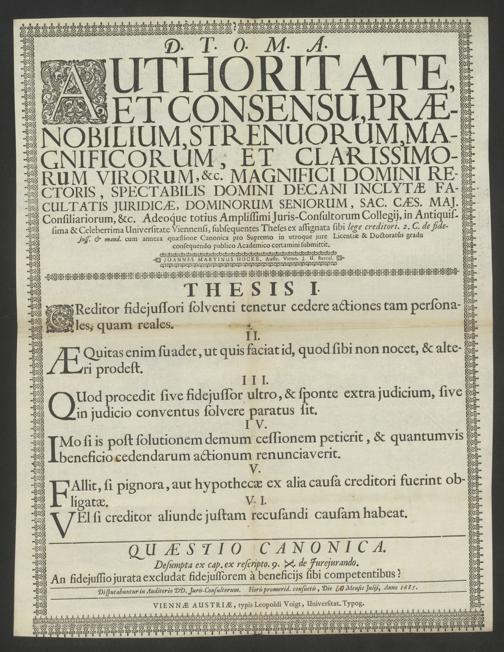 - TitelD. T. O. M. A. Authoritate, Et Consensu, Prænobilium, Strenuorum, Magnificorum, Et Clarissimorum, Virorum, &c. Magnifici Domini Rectoris, Spectabilis Domini Decani Inclytæ Facultatis Juridicæ, Dominorum Seniorum, Sac. Cæs. Maj. Consiliariorum, &c. Adeoque totius Amplissimi Juris-Consultorum Collegij, in Antiquissima & Celeberrima Universitate Viennensi, subsequentes Theses ex assignata sibi lege creditori. 2. C. de fidejuss. & mand. cum annexa quæstione Canonica pro Supremo in utroque jure Licentiæ & Doctoratûs gradu consequendo publico Academico certamini submittit : Disputabuntur in Auditorio DD. Juris-Consultorum. Horis pomerid. consuetis, Die ... Mensis Julij, Anno 1685 / Joannes Martinus Hocke, Austr. Vienn. J. U. Baccal.